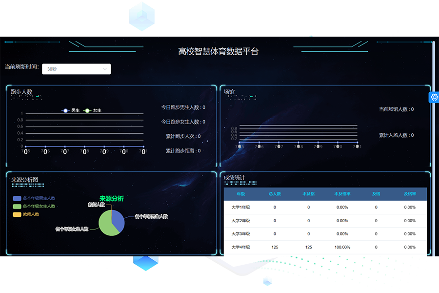 支持自定义锻炼计划、自定义学生锻炼规则、实时查看运动数据、多维度数据统计分析等。